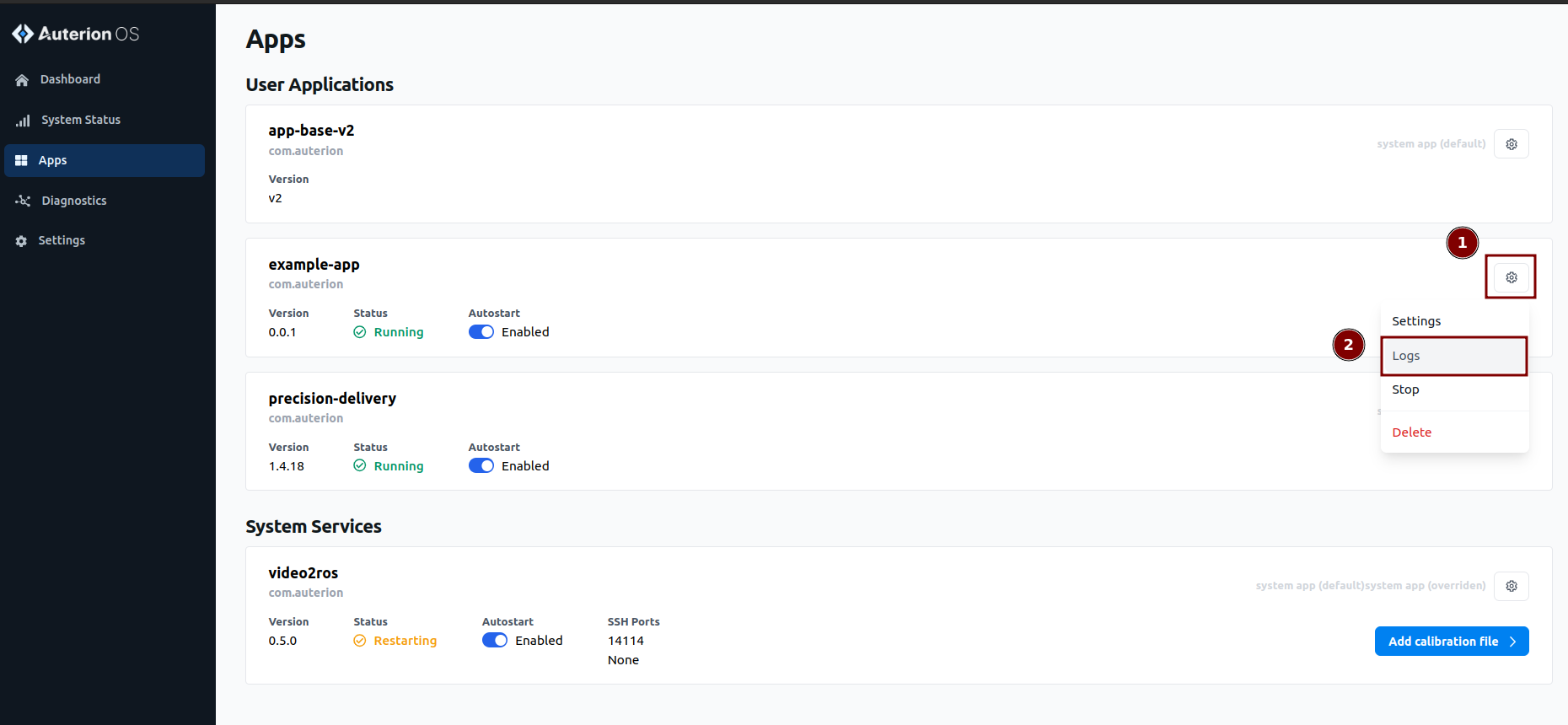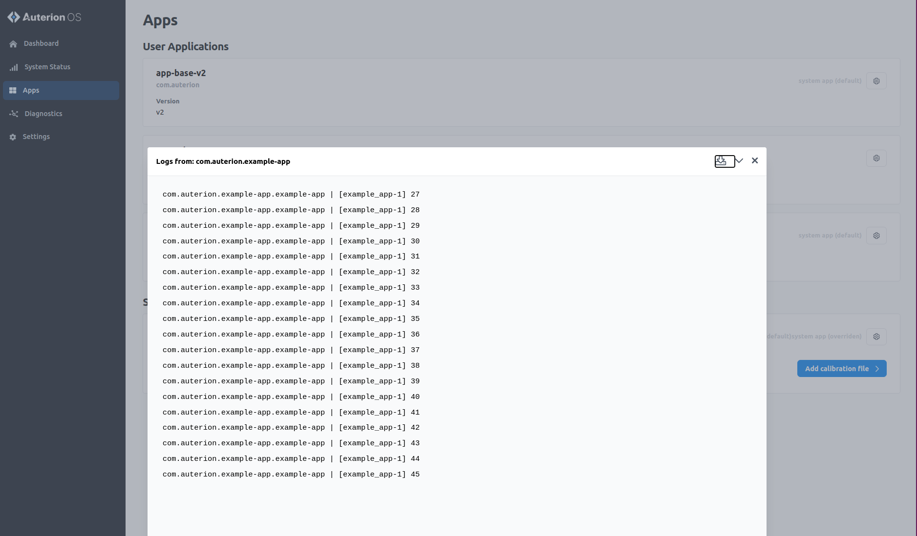 You can then view the application standard output by visiting the [Apps page](https://docs.auterion.com/vehicle-operation/settings-and-maintenance/vehicle-dashboard#apps) of the Vehicle Web UI. Click the cog icon at the top-right corner of your application widget, and select **Logs:**