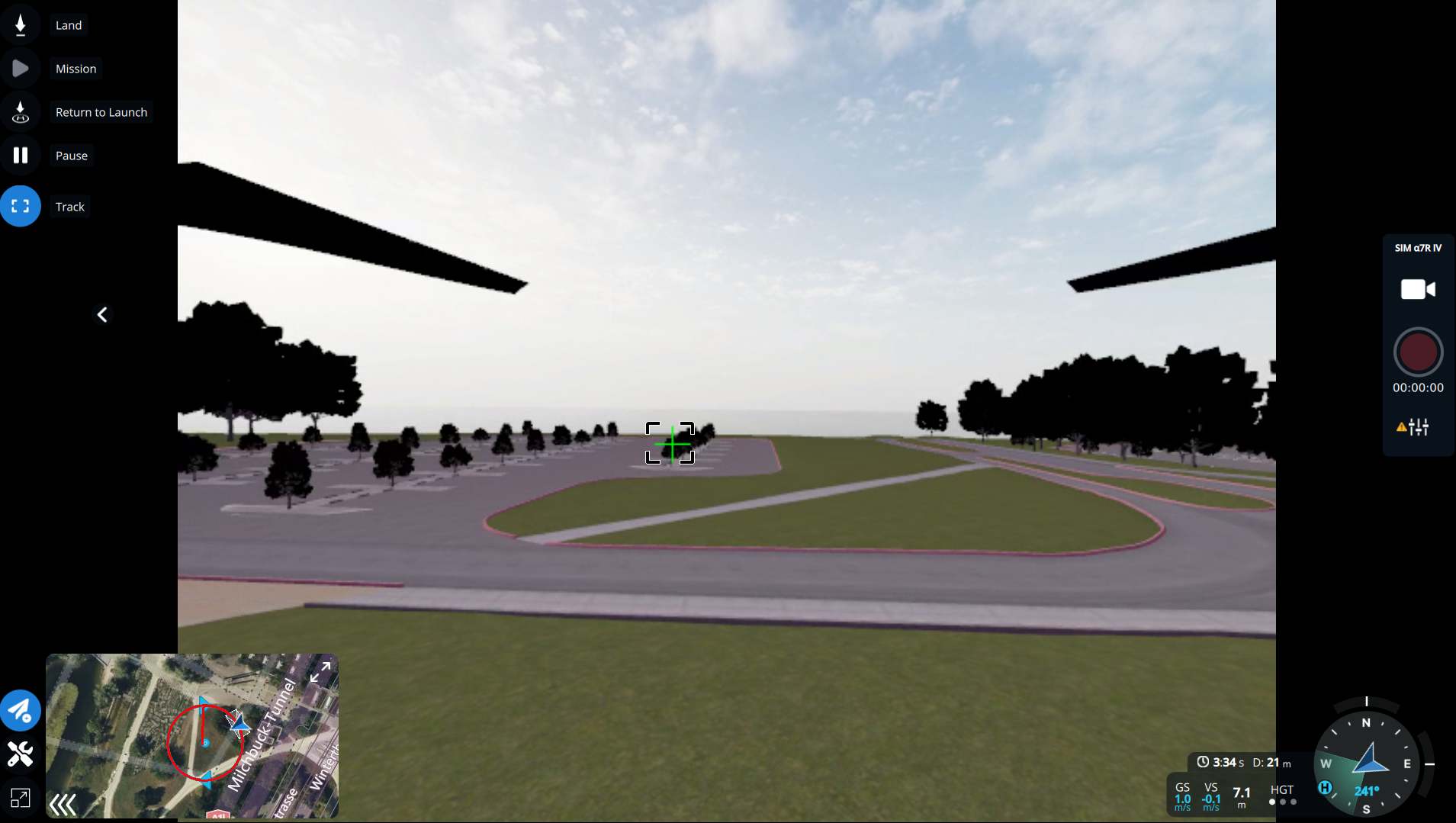 The screenshot above illustrates a simulated multicopter actively tracking a tree in a virtual 3D environment. The Tracking Interface is used inside of an AuterionOS app (see [app-framework](https://docs.auterion.com/app-development/app-framework "mention")) on the simulated drone; the Tracking Interface enables the app to receive tracking requests from AMC, e.g. object selection using the blue "Track" tool in the sidebar on the left, and images from the camera. The app uses the interface to provide a visual feedback to AMC, including the location of the tracked object in the frame (green crosshair and rectangle).