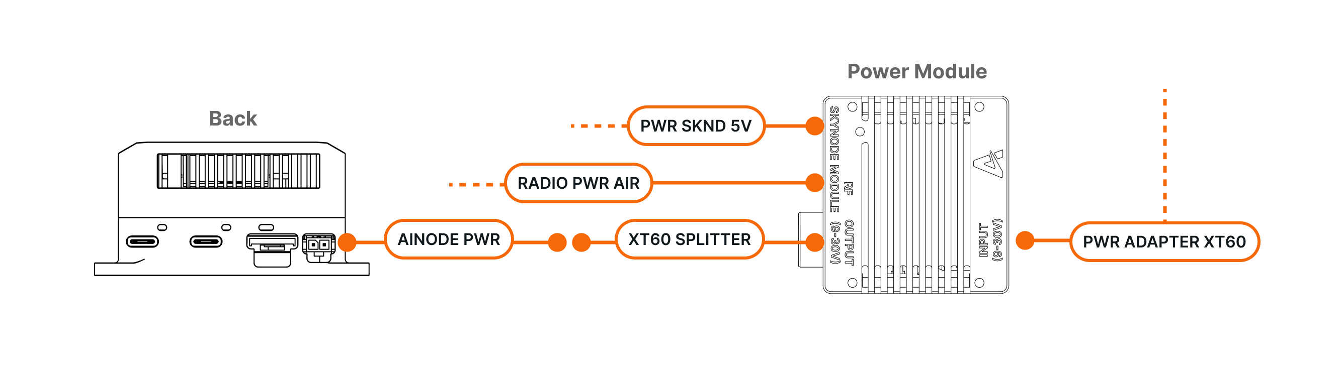 <figure><img src="https://3329189600-files.gitbook.io/~/files/v0/b/gitbook-x-prod.appspot.com/o/spaces%2FFW1Ge1p1f6WHyiYCb146%2Fuploads%2Fgit-blob-d9adbb2f02f39ee2becbebb8d2b5a9bab28b6aa8%2FAINode%20Power%20Full.png?alt=media" alt=""><figcaption><p>Powering AINode with Skynode and Radio unit via 6S Power Module</p></figcaption></figure>