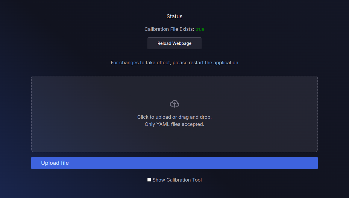 In the calibration webpage that opens, click the button to select a file to upload. Note that only YAML files are accepted. If the file uploads successfully, the **Calibration File Exists** status on the webpage will be **true**.