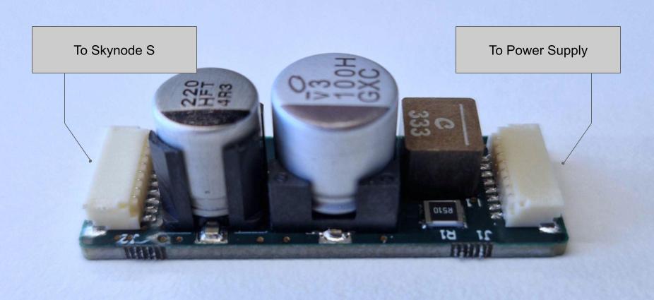 Make sure to have a capacitor between VBAT and GND or to have the Auterion Filter Board in series between the power source and Skynode S. Always use the Auterion Filter Board if you have it.