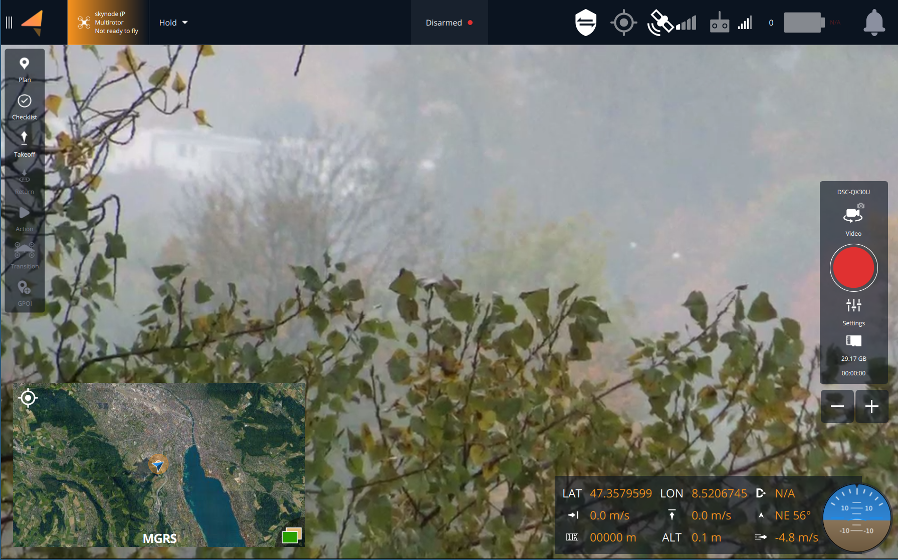 4. Click on the video feed (left corner) to make the video screen full screen and get the camera controls. For more information see [Fly View UI Overview](https://docs.auterion.com/hardware-integration/skynode/broken-reference) for AMC