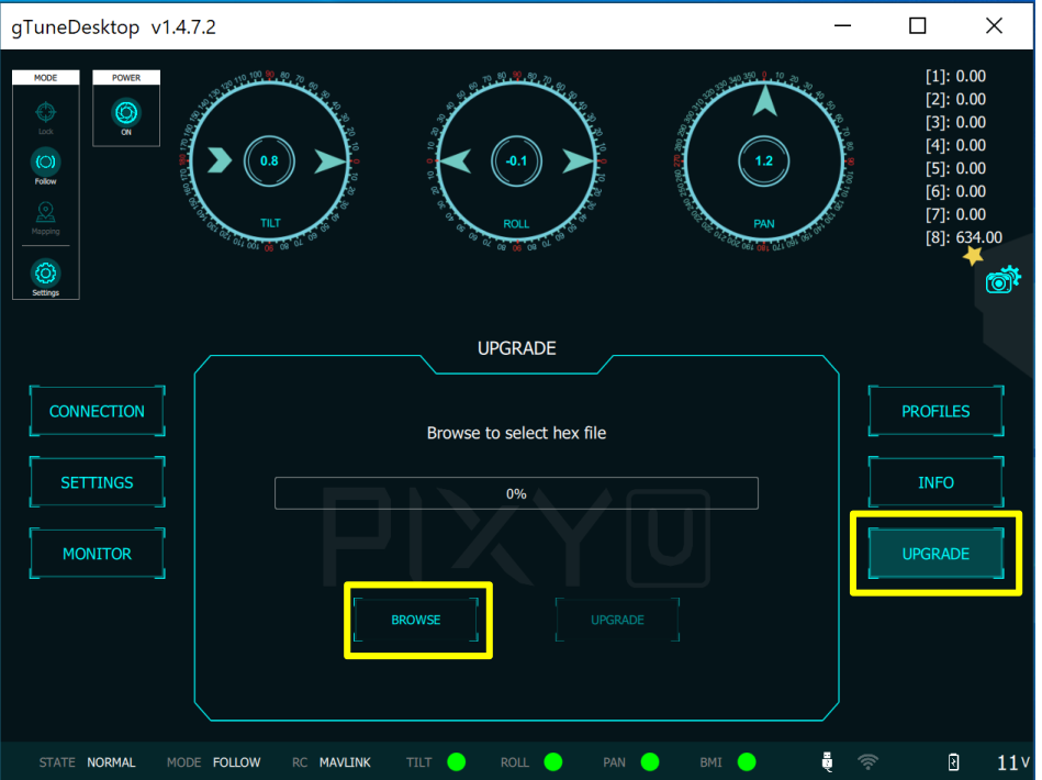 * Download the latest Gremsy gimbal firmware for your specific model [here](https://github.com/Gremsy/MAVLink-Protocol-V2-Firmware/releases) and use gTune to flash it onto your gimbal