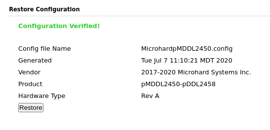 8. In the Microhard web interface, navigate to **System > Maintenance** and under **Restore Configuration** click **Choose File**. Select the correct configuration file from the previously downloaded archive and upload it.