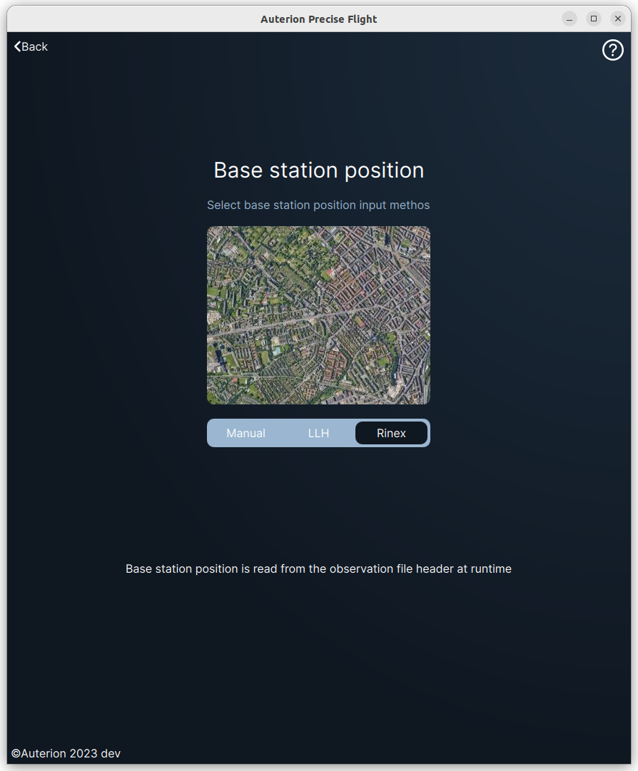 In this mode, you can select a LLH file logged by the base station (E.g Emlid RS2) in order to set the base station position. Precise Flight will average the position and show the result on the map.