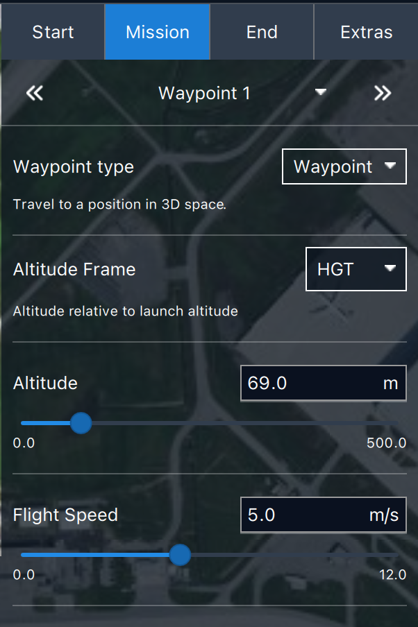 Set the initial altitude and the flight speed for the mission. The altitude can be changed in waypoints, and will persist to subsequent waypoints.