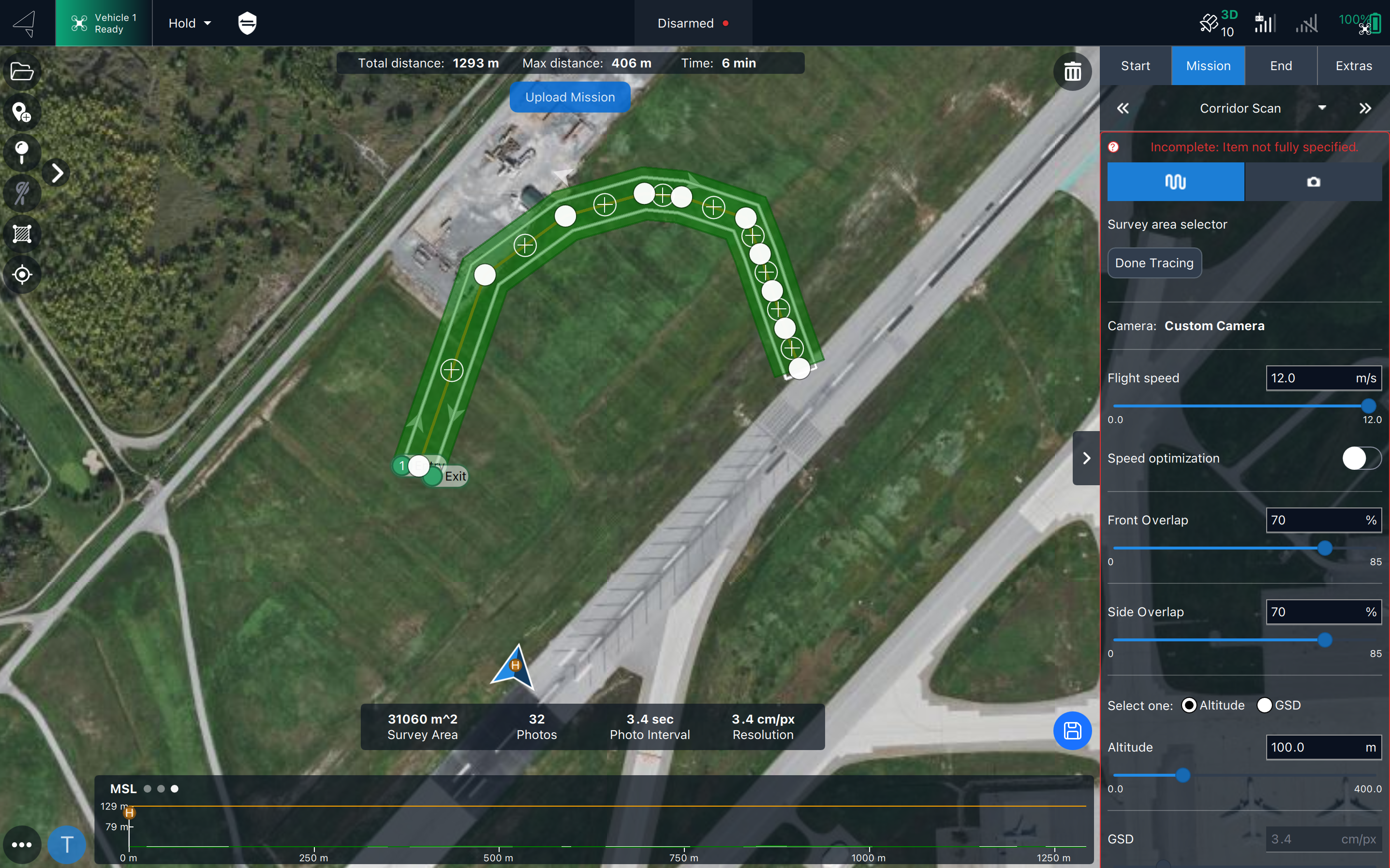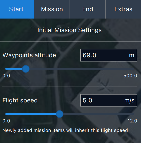 2. Check that the [Mission Start](https://docs.auterion.com/vehicle-operation/auterion-mission-control/ui-breakdown/mission-editor-tab/mission-item-reference#mission-start-editor-defaults) item settings are correct for the planned scan. In particular, the altitude (**Waypoint altitude**) is high enough to avoid obstacles when travelling to the corridor.