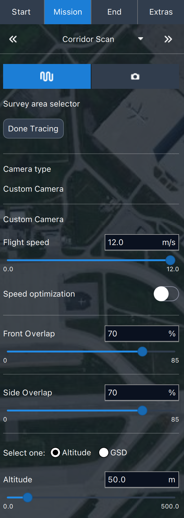 For a *predefined* or *custom* camera the scan settings allow users to choose a desired image overlap and set either desired scan altitude or image resolution for the ground surface (automatically calculating the other value).