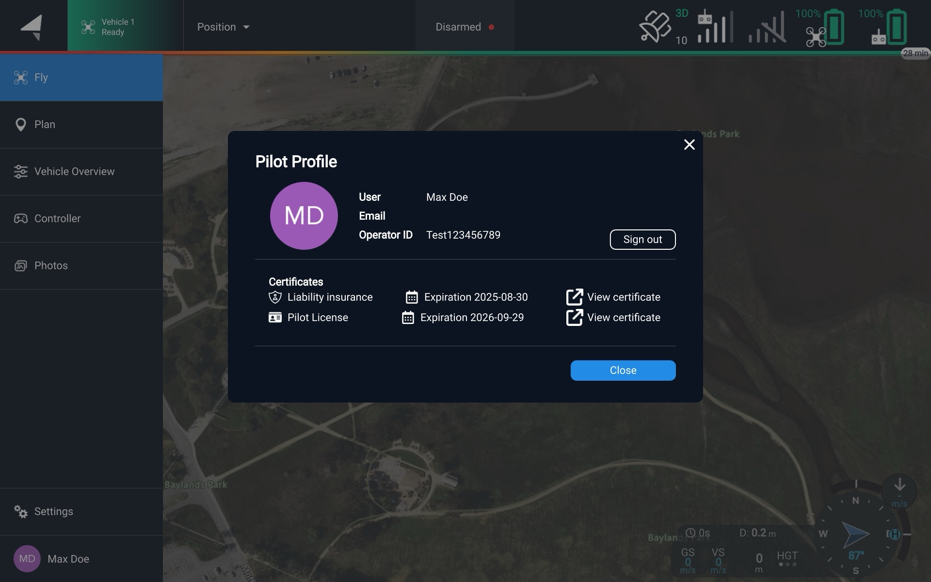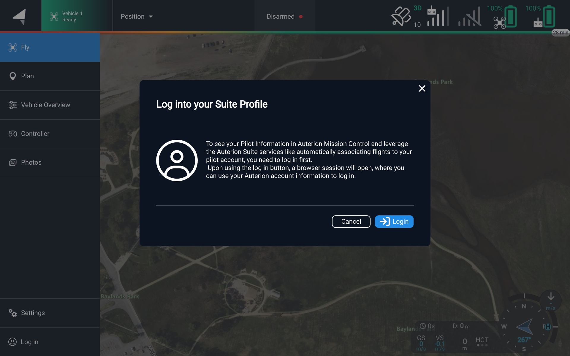 Pilots can log in to their Suite account directly from AMC. This enables automatic pilot flight hours tracking in the Auterion Suite.
