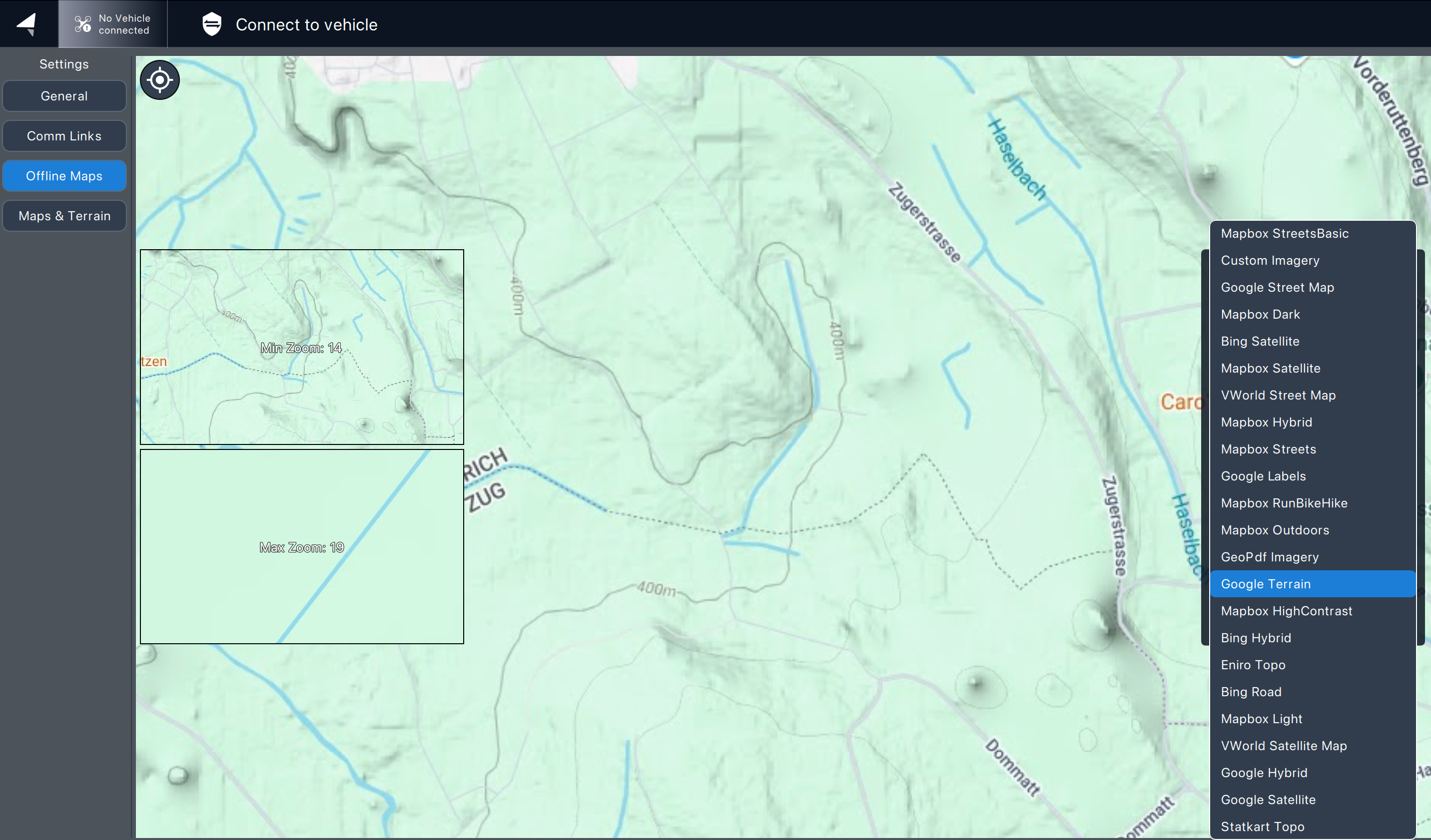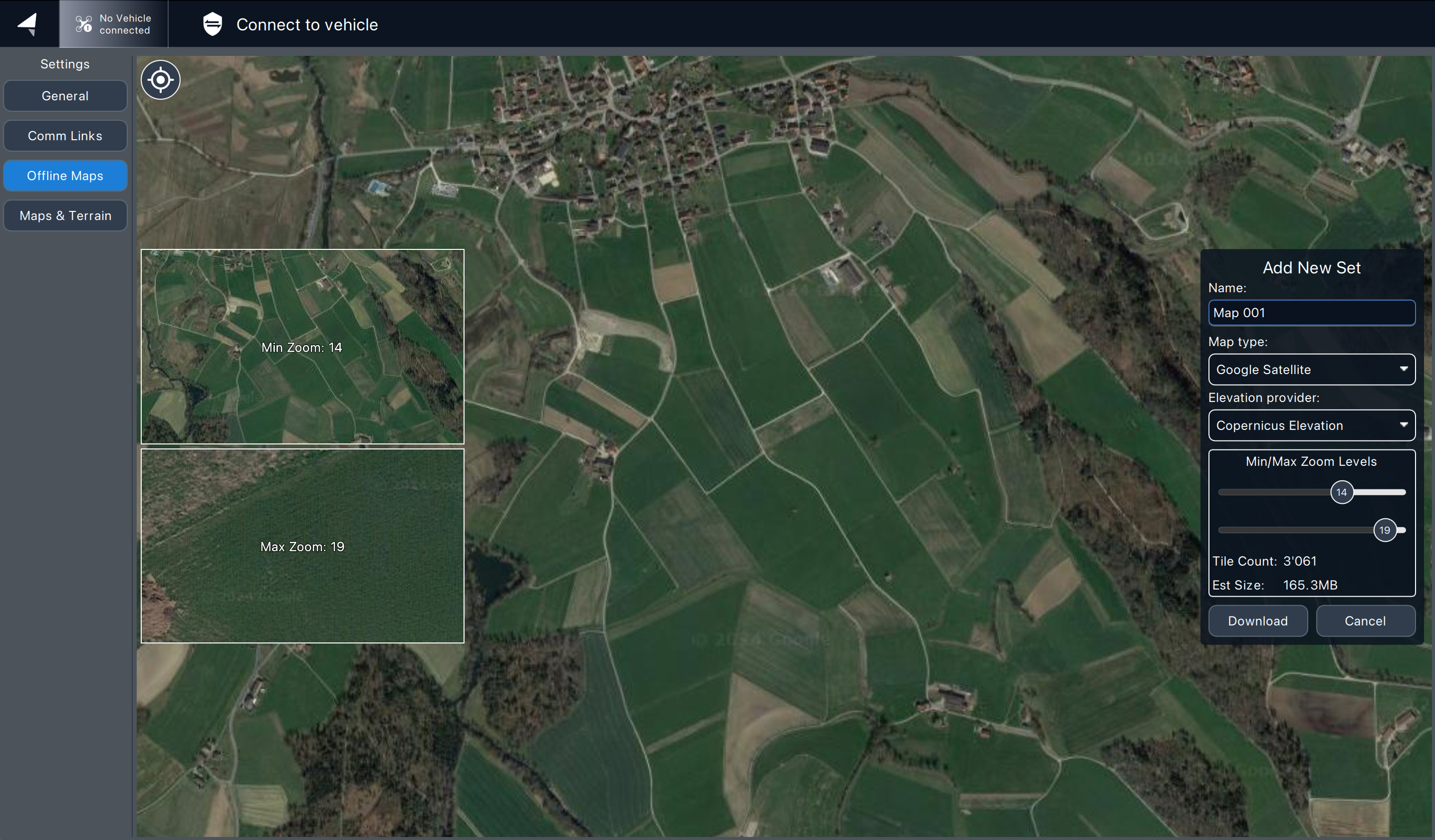 To use this feature, the offline map must be downloaded to the GCS while an internet connection is active. Alternatively, a previously generated offline map can also be imported.