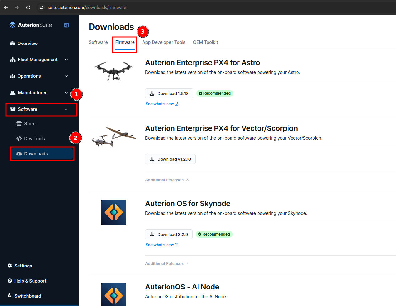1. Download the latest Auterion Enterprise PX4 software release from the [Auterion Suite](https://suite.auterion.com/store/firmware) by heading to **Software > Downloads > Firmware** and selecting your appropriate PX4 release.<img src="https://3329189600-files.gitbook.io/~/files/v0/b/gitbook-x-prod.appspot.com/o/spaces%2FFW1Ge1p1f6WHyiYCb146%2Fuploads%2Fgit-blob-48d237b73c7707f54a0183889e7e878bd25939d5%2FSuite_PX4.png?alt=media" alt="" data-size="original">