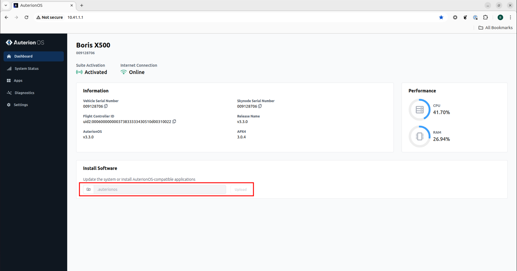 <figure><img src="https://3329189600-files.gitbook.io/~/files/v0/b/gitbook-x-prod.appspot.com/o/spaces%2FFW1Ge1p1f6WHyiYCb146%2Fuploads%2Fgit-blob-f05b84da09d215ff2c866b9ca95021c891a41af4%2FDashboard_drawn.png?alt=media" alt=""><figcaption><p>The Vehicle Web UI allows updating AuterionOS by uploading an .auterionos file</p></figcaption></figure>